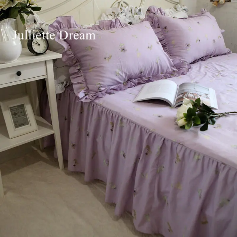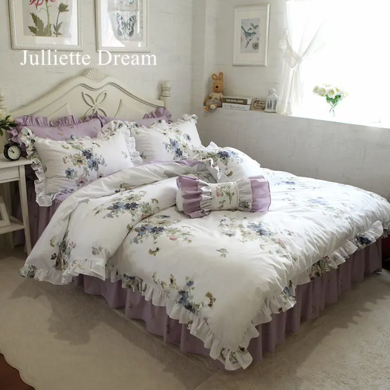 Special Hot Purple flower Printed bedding set Garden ruffle duvet cover set bed sheet bed clothes king size